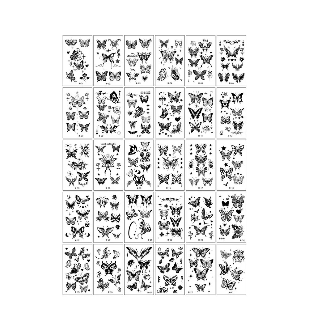 - Contenido del paquete: 30 unidades de tatuajes temporales con motivos de mariposas y flores.