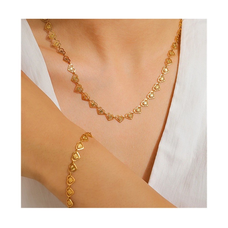 Elegante conjunto con motivo de corazones de acero inoxidable de alta calidad con brillo duradero, adecuado para pieles sensibles y uso diario. Descripción completa