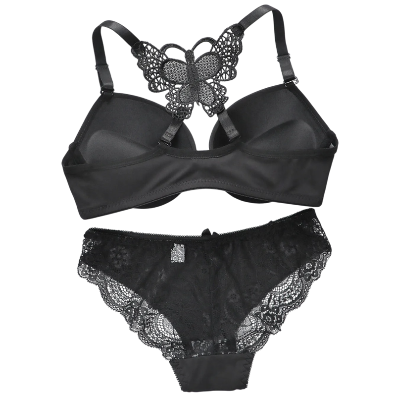 Conjunto de lencería de encaje para mujer con espalda decorativa en forma de mariposa, sujetador y bragas, poliéster y elastano para uso diario