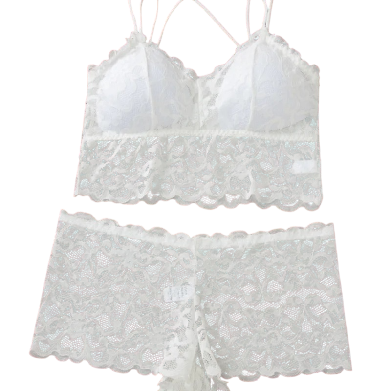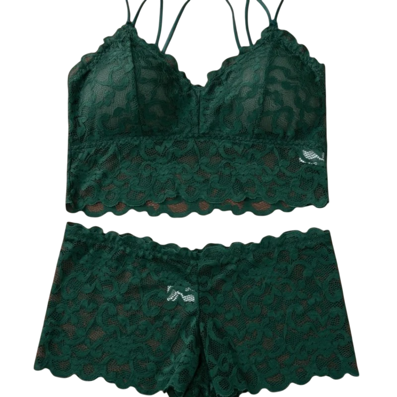 La composición del material incluye poliamida y elastano, lo que asegura elasticidad y ajuste al cuerpo. El sujetador tiene tirantes delgados y una construcción ligera sin refuerzos innecesarios, mientras que las bragas tienen un corte más amplio con un acabado de encaje. Esto hace que el conjunto se ajuste bien y se adapte al movimiento. El diseño de encaje es un elemento destacado que es visible a simple vista. El diseño general es unificado y se siente compacto.