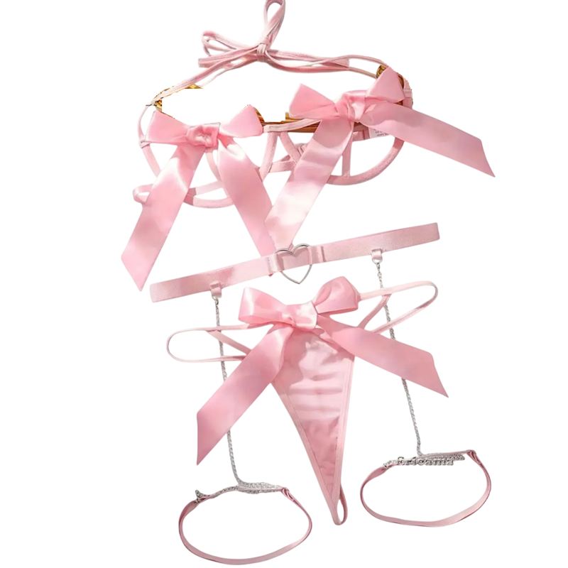 El conjunto de lencería femenina está compuesto por un sujetador y bragas complementados con elementos decorativos llamativos. El detalle dominante son las cintas y los lazos decorativos, que forman el principal elemento visual de todo el conjunto. La construcción de las diferentes partes está diseñada para que armonicen y creen una apariencia unificada. El material de poliéster y spandex contribuye a la elasticidad y adaptación al uso. El conjunto es adecuado para uso diario y también como complemento de lencería.