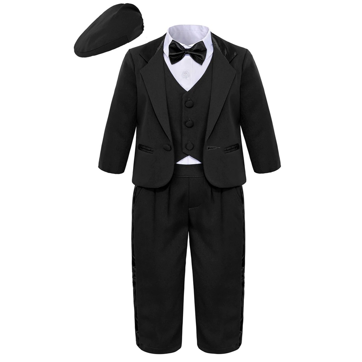 Contenido del paquete: 1x saco, 1x chaleco, 1x camisa, 1x pantalones, 1x pajarita, 1x gorra