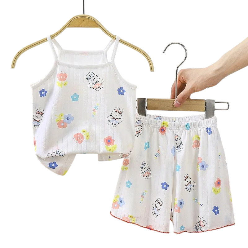 Conjunto de verano blanco para niña, top con tirantes finos y pantalones cortos. Estampado de conejitos con flores. Escote en O.