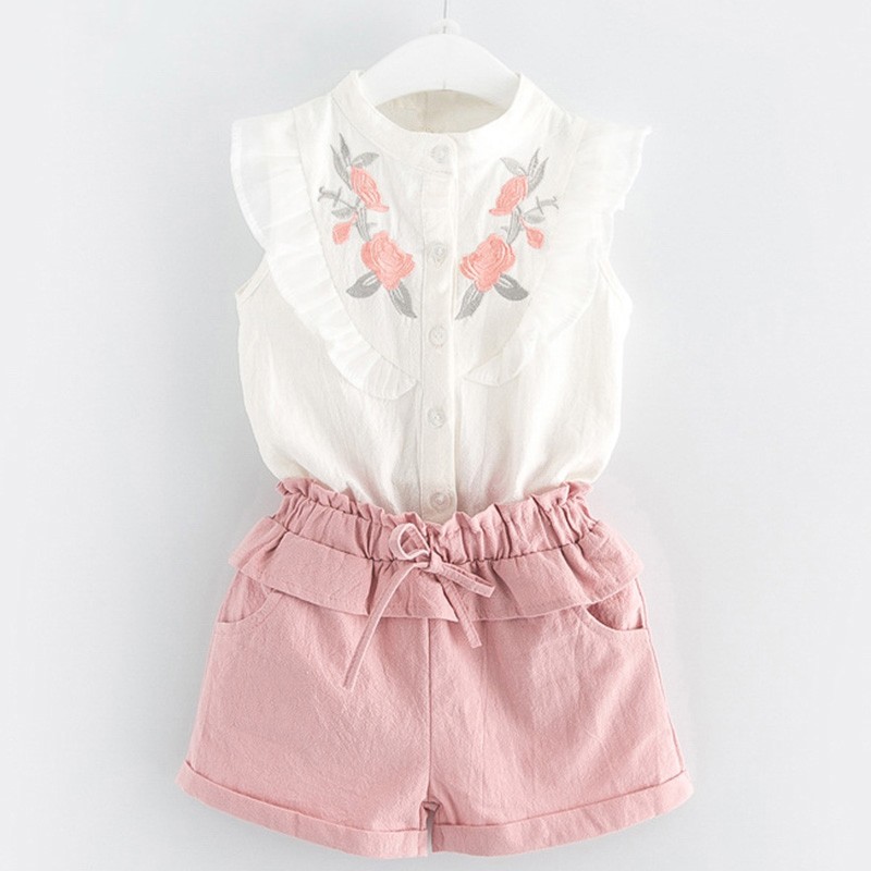 El conjunto se compone de una camiseta de tirantes blanca con flores y mangas con volantes y un pantalón corto de color rosa con cordones.