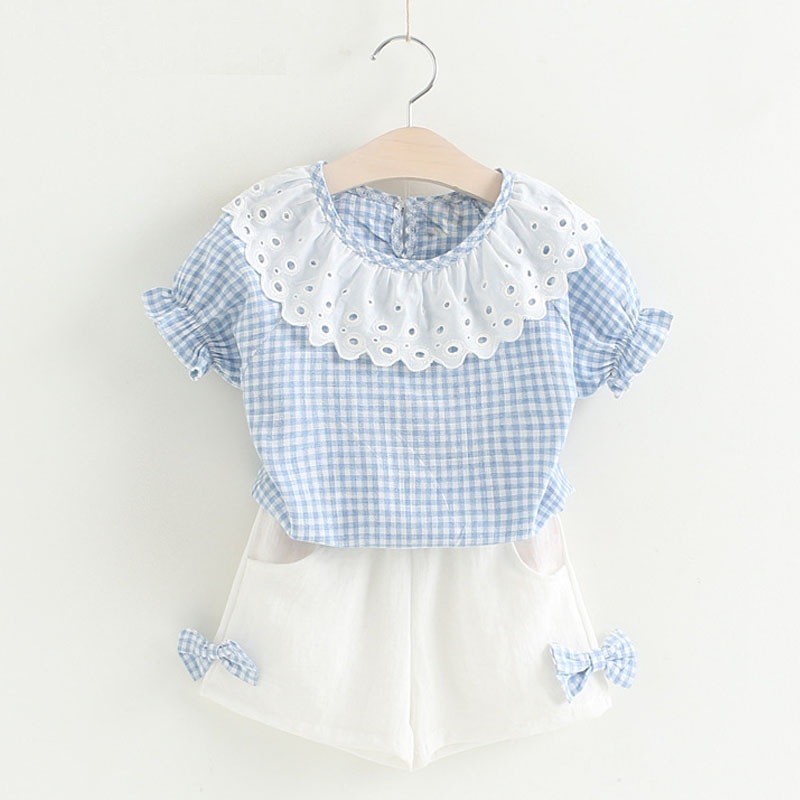Conjunto niña cuadros con encaje y lazos J1265