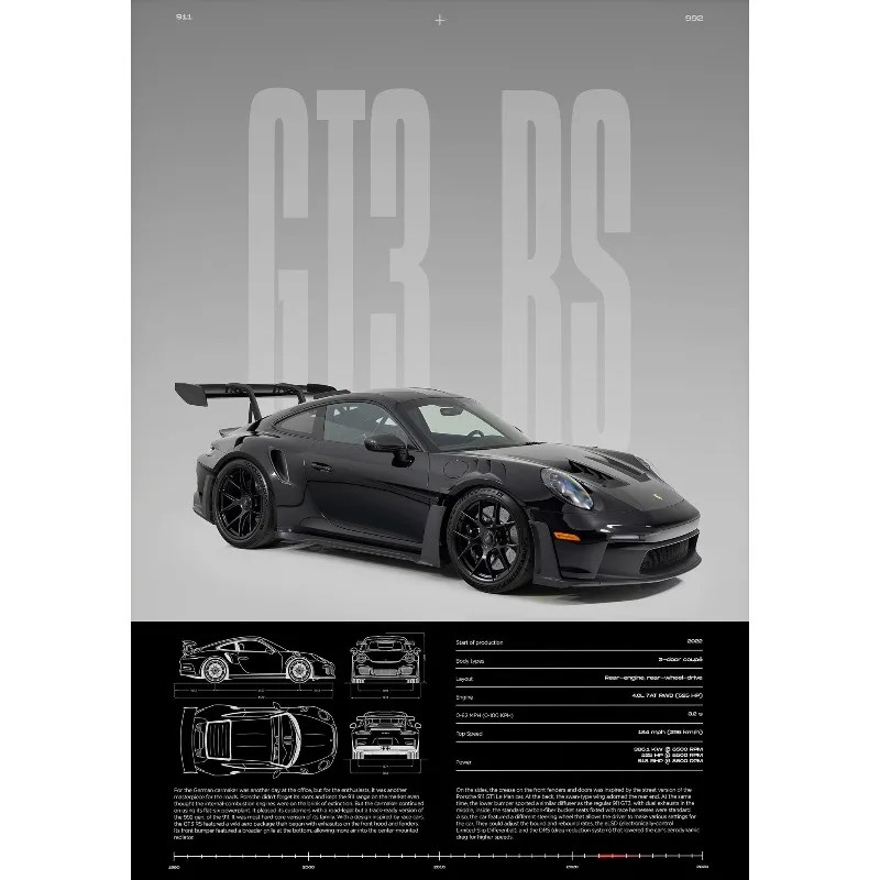 Póster con el motivo GT3-RS y dibujos técnicos en un formato práctico, adecuado como complemento para un interior moderno o una oficina. Descripción completa