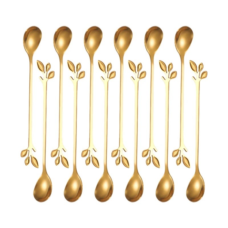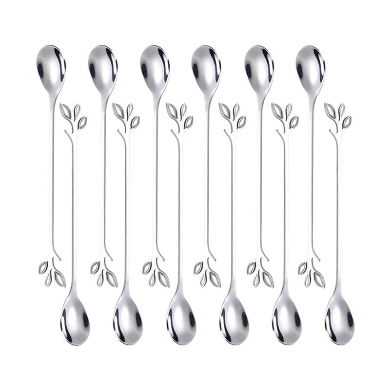 Cucharas de té largas de acero inoxidable con mango decorativo en forma de hoja, cucharas de postre para café, té, helado, fruta, cubiertos elegantes, 12 unidades