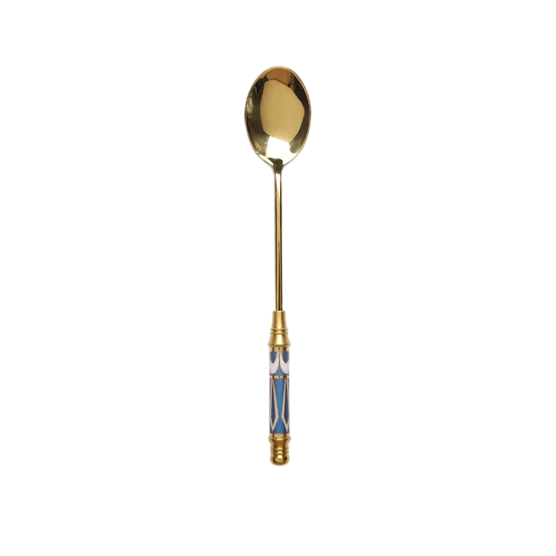 Gracias a su diseño elegante, la cucharita puede servir no solo como un utensilio de cocina práctico, sino también como un complemento estiloso para la mesa. Cucharita de postre dorada con mango azul y dorado puede aportar un aspecto lujoso y moderno a cualquier servicio.