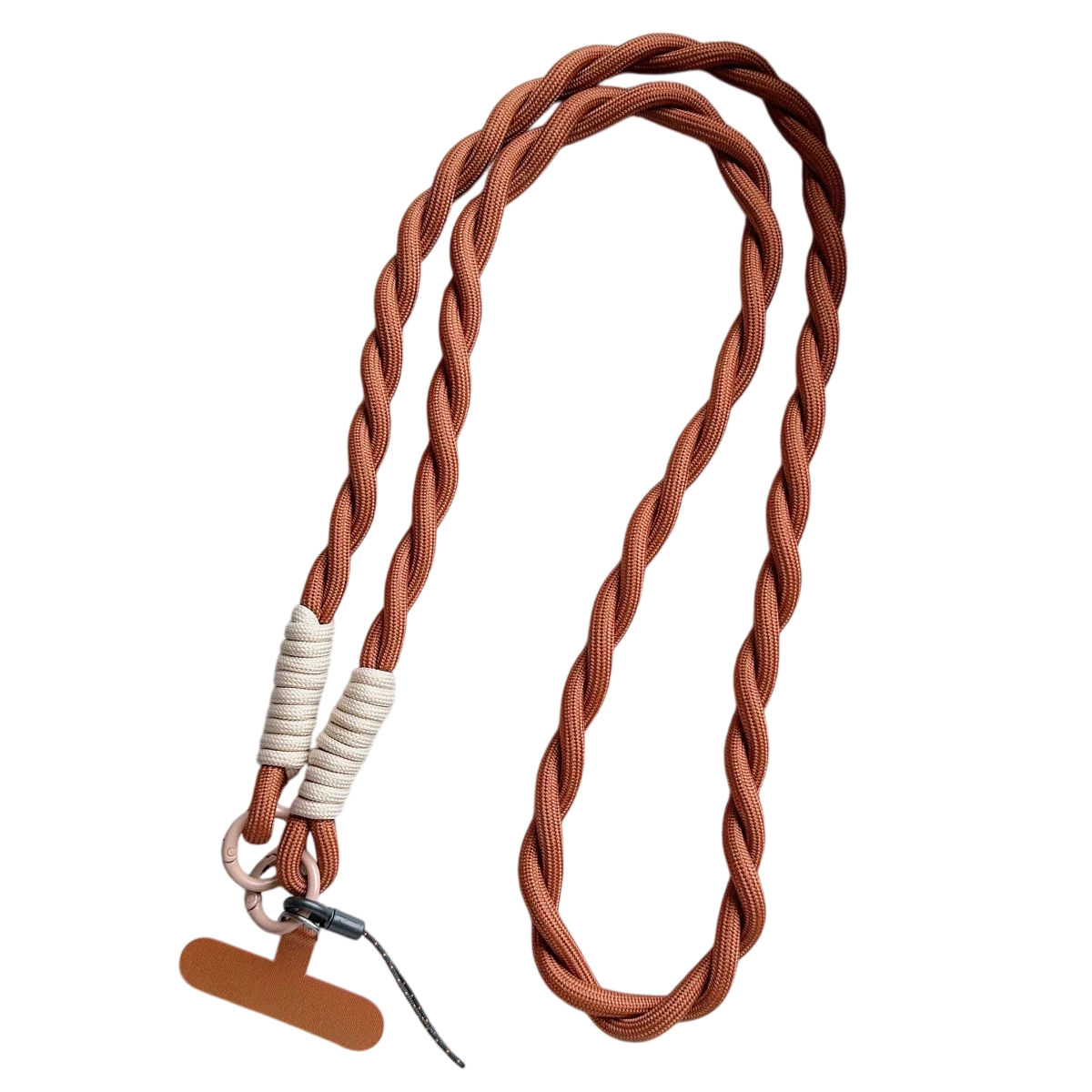 La correa está compuesta por una cuerda trenzada doble, que tiene un elegante diseño retorcido. Gracias a esto, la cuerda no solo es práctica, sino también muy estilosa. En la imagen se pueden ver varias variantes de color – por ejemplo, marrón, burdeos, azul, beige y morado. Estos colores permiten combinar fácilmente el accesorio con el teléfono, la ropa o otros complementos.