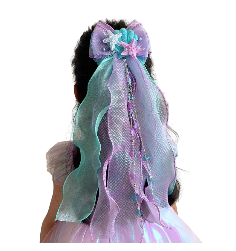 Adorno capilar mágico para niñas con motivo marino, lazo brillante y cintas largas. Ideal para celebraciones, sesiones de fotos y peinados festivos. Descripción completa