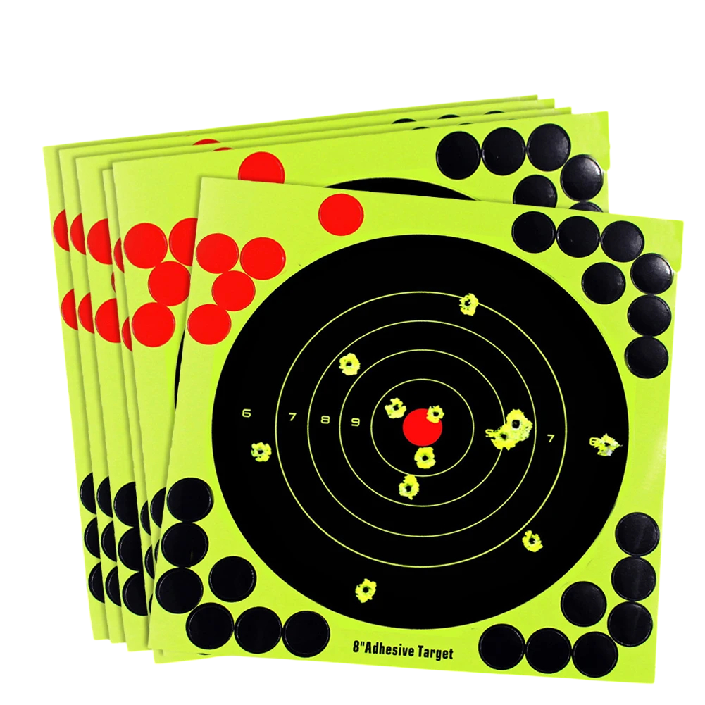 Las dianas tienen un forma redonda universal con un diámetro de 203 mm (8 pulgadas), que es adecuada para pistolas, carabinas de aire y rifles deportivos. Gracias a los parches adhesivos incluidos, se puede reutilizar una diana, lo que ahorra costos y material. El producto es un gran complemento para mejorar la precisión, concentración y consistencia en el tiro.