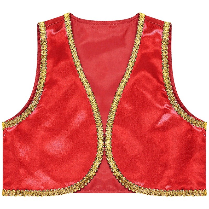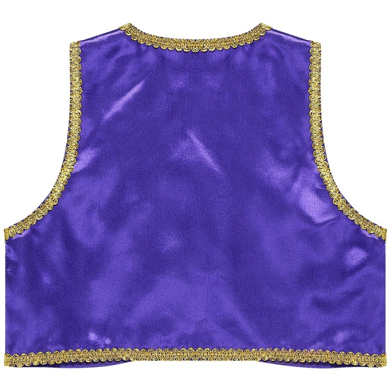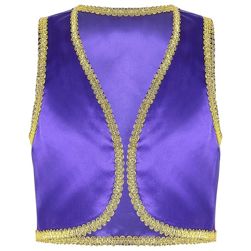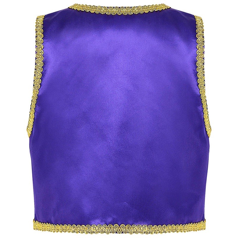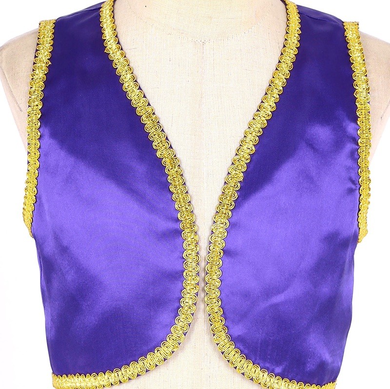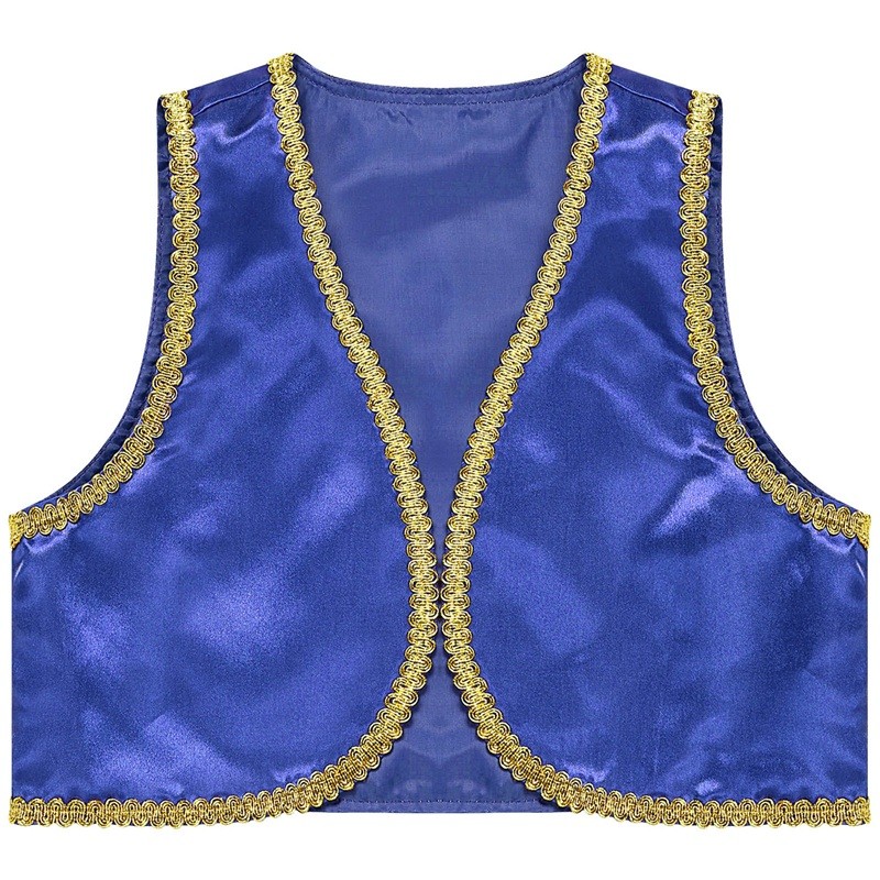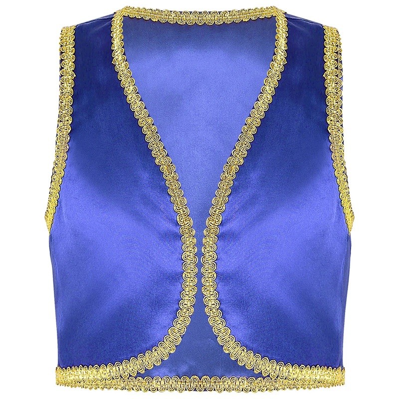Este disfraz de príncipe árabe para niños traerá al armario infantil el encanto de los cuentos orientales. Hecho de poliéster ligero y brillante, proporciona comodidad incluso durante largas horas de uso. El ribete dorado y el corte abierto del chaleco de mezclilla le dan al disfraz un aspecto auténtico inspirado en los cuentos de las Mil y Una Noches. El chaleco es ideal para carnaval, Halloween, fiestas de disfraces o cosplay y combina perfectamente con pantalones sueltos o accesorios como turbantes o cinturones. Gracias a su diseño en varios tonos sólidos, es fácil elegir la variante que mejor se adapte al carácter y estilo del niño.