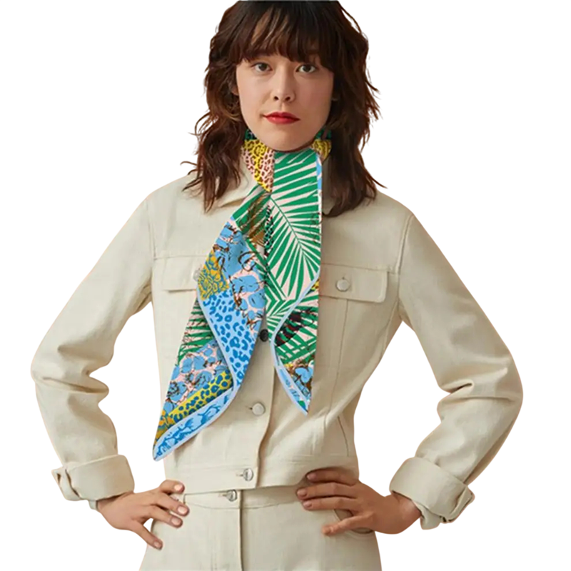 Agregue frescura exótica y el encanto del estilo francés a su atuendo. Este pañuelo cuadrado para mujer con un diseño inspirado en la selva combina la tendencia de moda con la elegancia atemporal. Es la elección ideal para mujeres que desean destacar entre la multitud y al mismo tiempo mantener un aspecto elegante y sofisticado. Es adecuado tanto para el uso diario como para ocasiones especiales.
