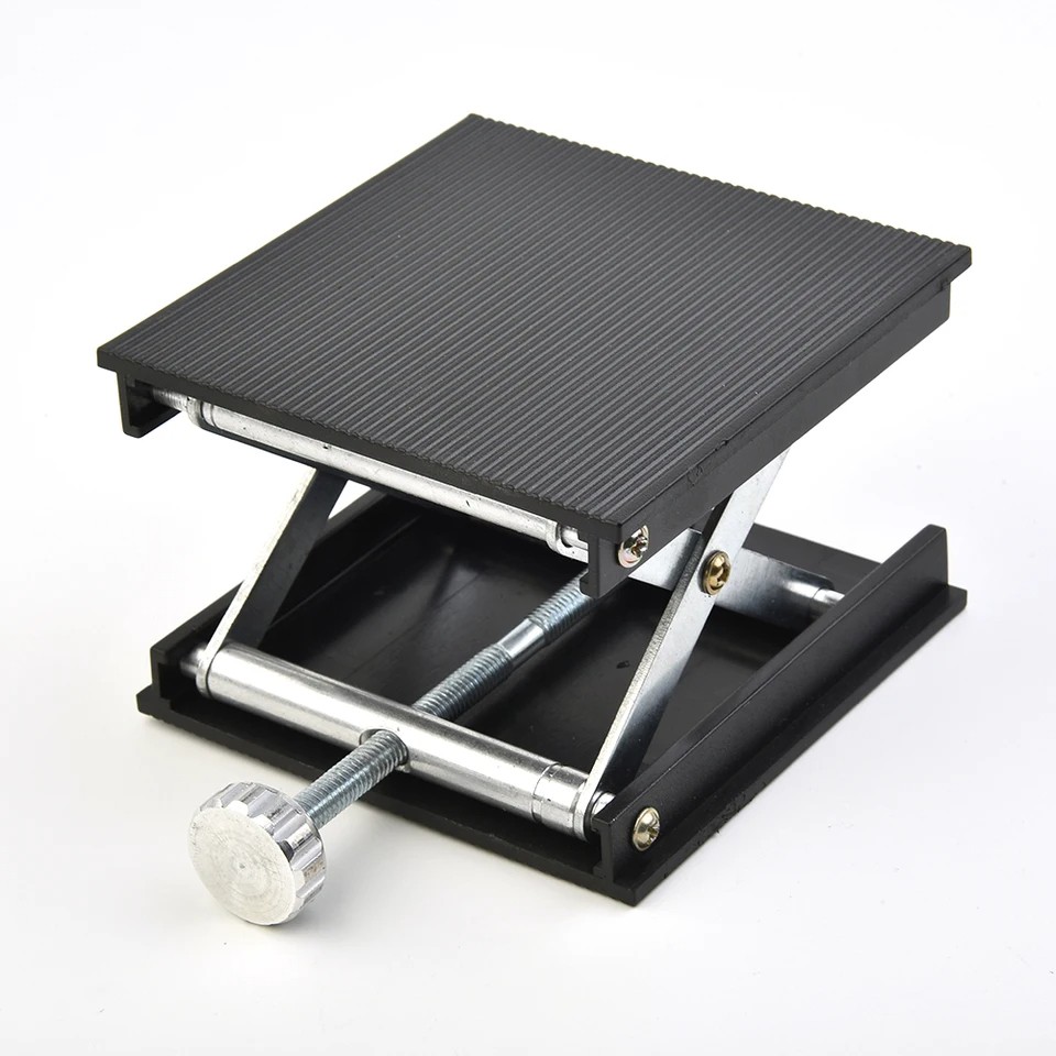 Elevador de laboratorio de acero inoxidable con altura ajustable, ideal para experimentos, talleres y uso doméstico, construcción estable y duradera. Descripción completa