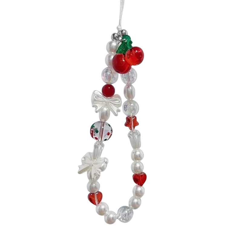 Encantador collar de cuentas para teléfono con cerezas Llavero de muñeca Pulsera de perlas para móvil Llavero con corazones y lazo rojo blanco