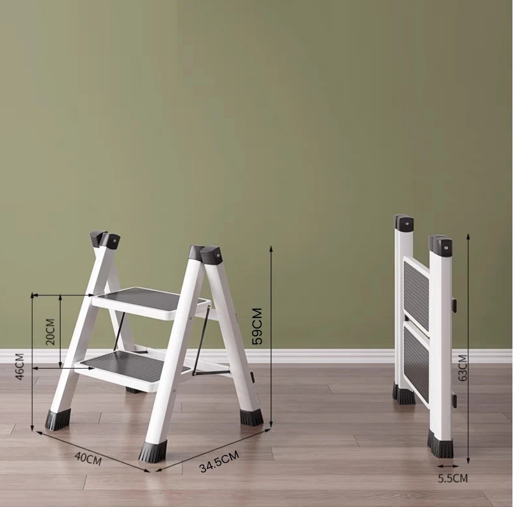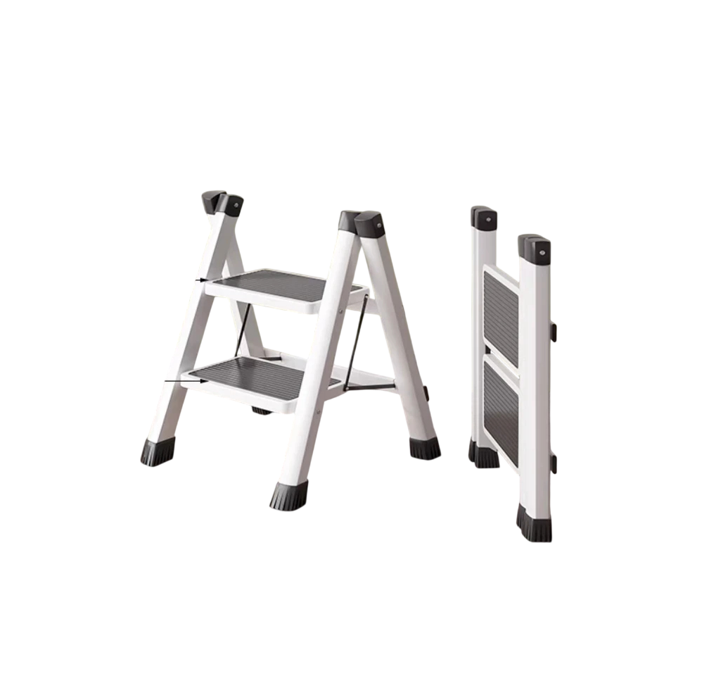 Escalera plegable compacta de dos peldaños de acero al carbono, capacidad de 150 kg, patas antideslizantes y fácil almacenamiento. Descripción completa