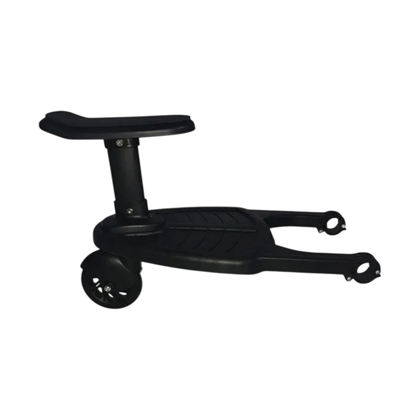 Este escalón universal para carrito de bebé para segundo hijo es la solución ideal para padres que desean transportar cómodamente a su hijo mayor junto con su hermano menor. Gracias al asiento extraíble, el niño puede elegir si quiere estar de pie o sentado. La estructura está fabricada con material PP resistente, que asegura la solidez y estabilidad, mientras que la rueda PU proporciona un desplazamiento suave y silencioso sobre diversas superficies. La instalación es sencilla y no requiere herramientas; el escalón se fija fácilmente a la barra horizontal del carrito mediante un soporte universal.