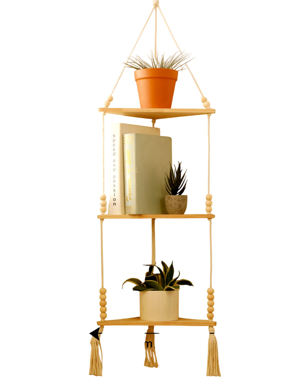 Estante esquinero suspendido de madera de dos niveles con bolas decorativas en cuerdas. Se entrega sin decoraciones ni flores. Descripción completa