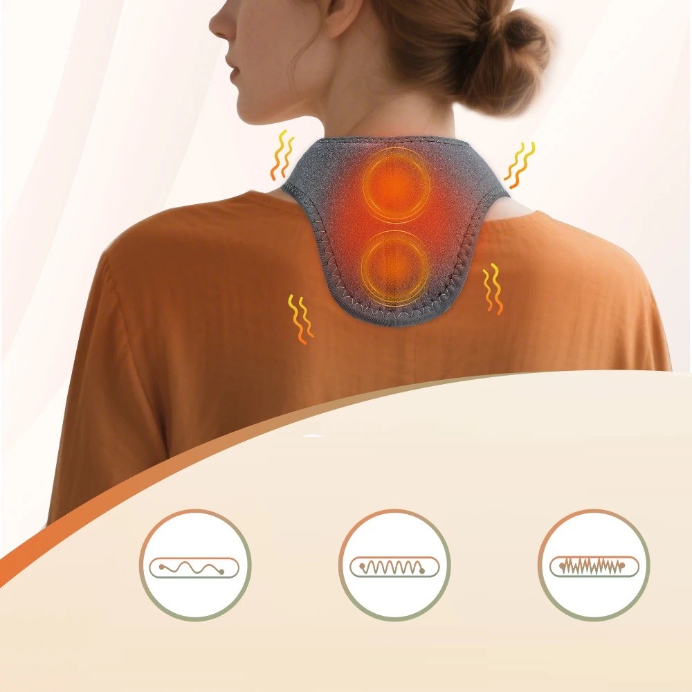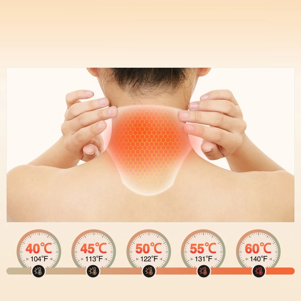 La faja térmica eléctrica para el cuello está diseñada para liberar de manera específica el área del cuello y los hombros mediante una combinación de temperaturas ajustables y modos de vibración. La superficie calefactora cubre uniformemente el área del cuello, ayudando a aliviar la rigidez, la fatiga y la tensión muscular durante el trabajo, los viajes, el descanso o al caminar. Gracias a su funcionamiento inalámbrico y a su construcción ligera, se puede usar la faja en cualquier lugar sin restricciones de movimiento.