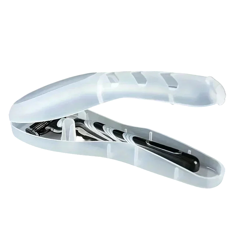Caja de almacenamiento de plástico que protege la maquinilla de afeitar y la cuchilla durante el almacenamiento y el viaje, asegurando higiene y un transporte seguro. Descripción completa