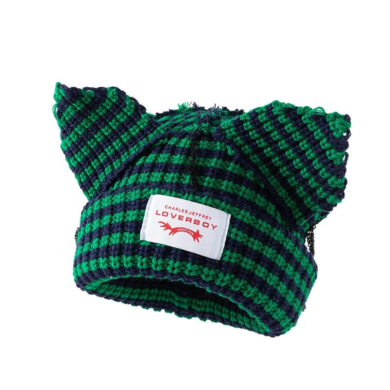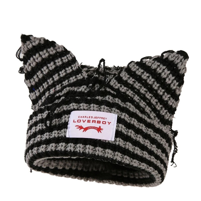 Gorro de invierno a rayas original con orejas de gato en estilo unisex. Tejido de ganchillo cálido, aspecto moderno de hip-hop y elección ideal para la temporada invernal. Descripción completa