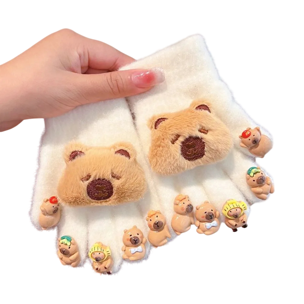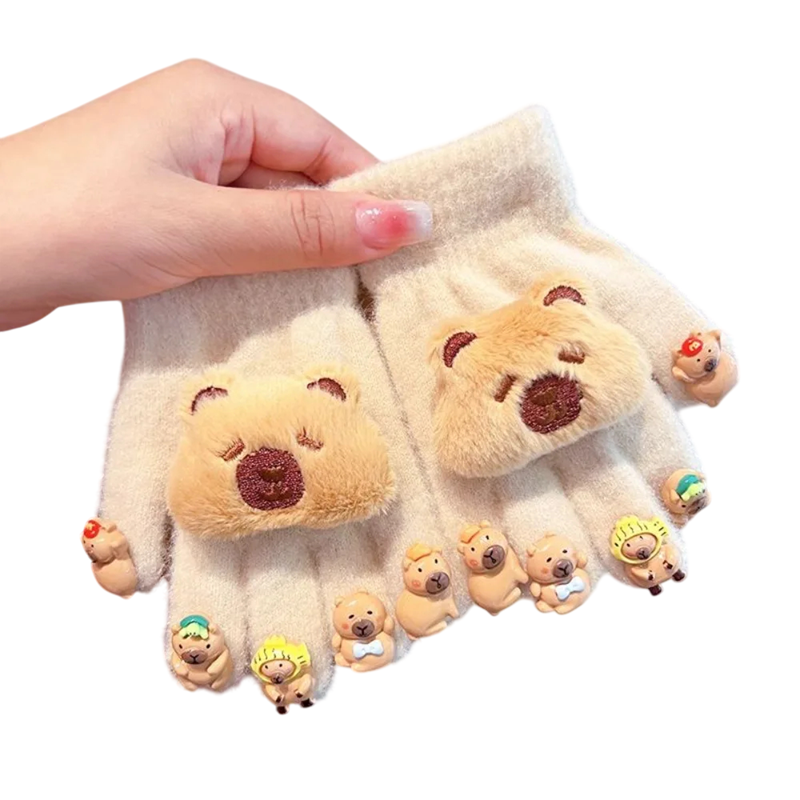 Guantes suaves para niños con motivo en relieve de capibara que calientan las manos, ofrecen comodidad y un aspecto juguetón durante las actividades invernales. Descripción completa