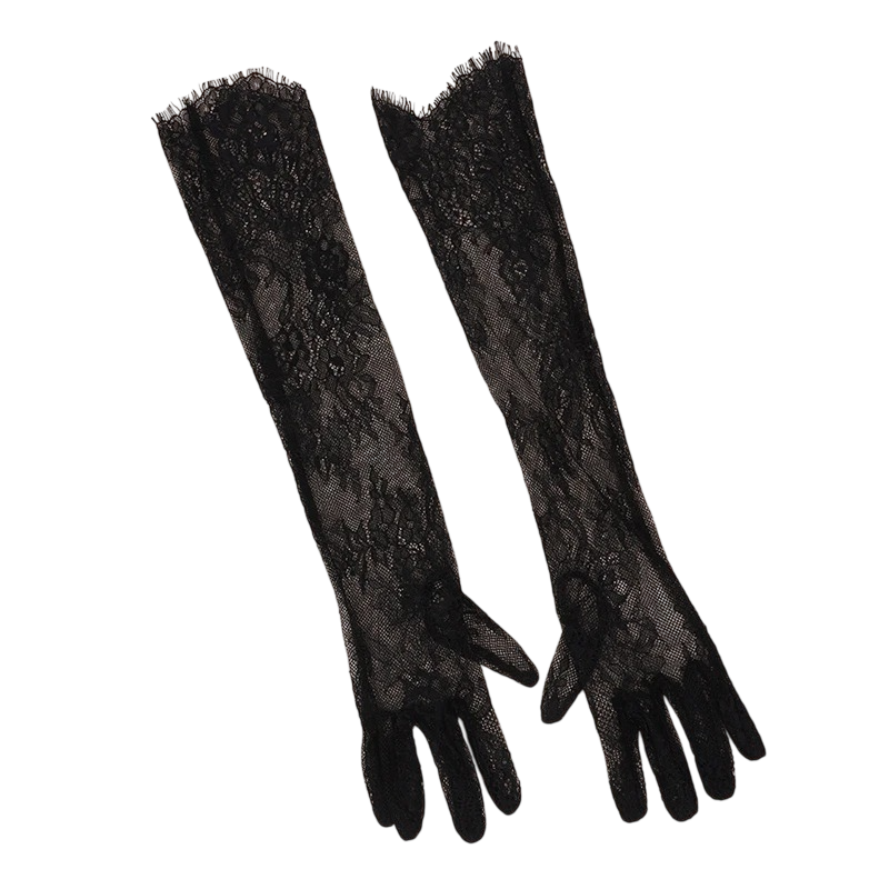 El diseño de dedos completos permite una cobertura total de las manos y mantiene una apariencia uniforme. El patrón de encaje se distribuye uniformemente a lo largo de los guantes, creando un efecto decorativo. El corte alargado otorga a los guantes un carácter más distintivo y resalta el atuendo general.
