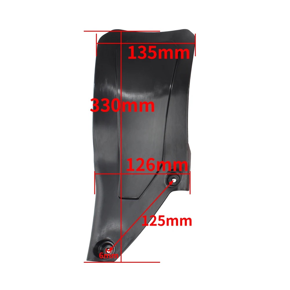 - Instrucciones de instalación: el guardabarros se coloca sobre el amortiguador trasero en el espacio entre el chasis y el basculante, se alinea con los puntos de montaje originales y se fija con los tornillos existentes de la moto