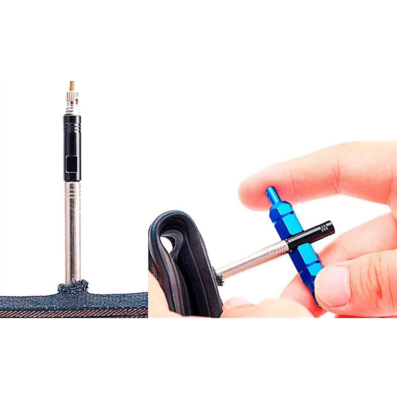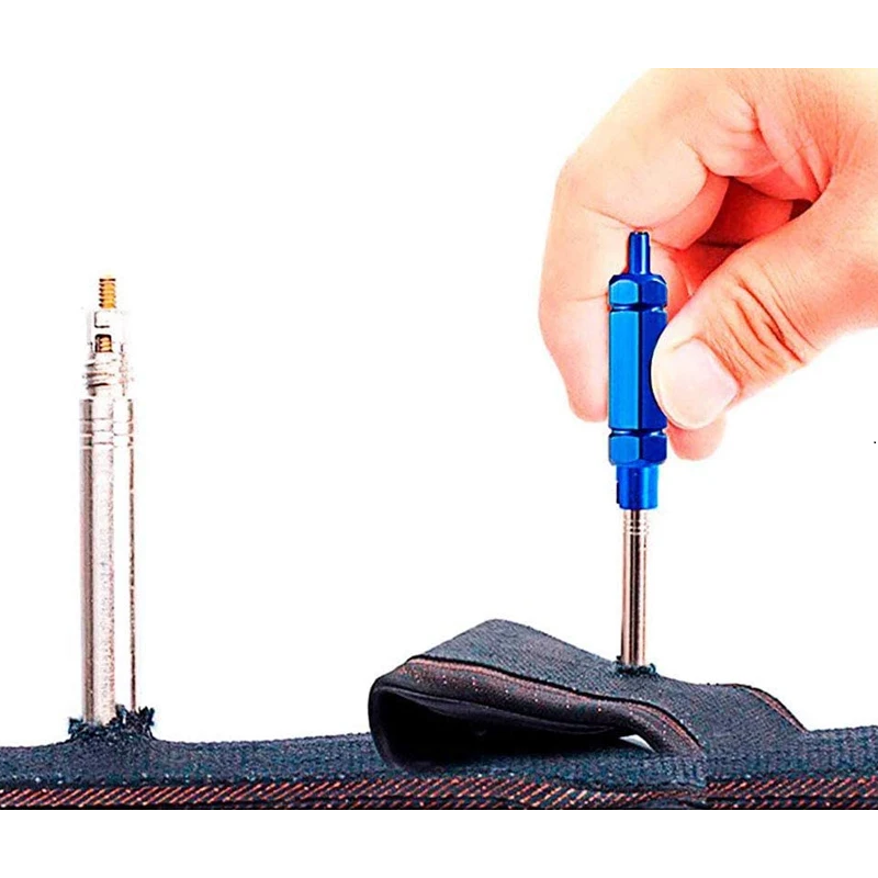 Herramienta de aluminio resistente para un fácil desmontaje de válvulas Presta y Schrader. Ligera, compacta e ideal para reparaciones de bicicletas en casa y en la carretera. Descripción completa