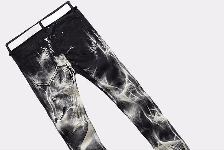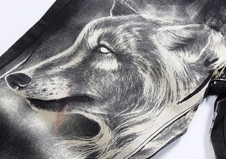 Le ofrecemos estos hermosos jeans de hombre con estampado de lobo.