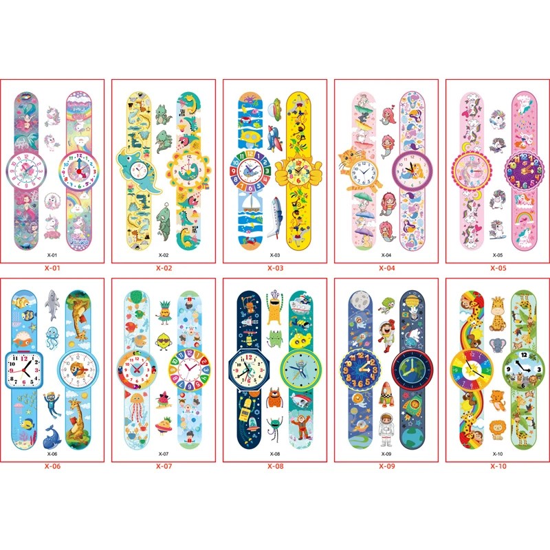 • 10 diseños diferentes de relojes – animales, dinosaurios, mundo marino, espacio, unicornios y más.