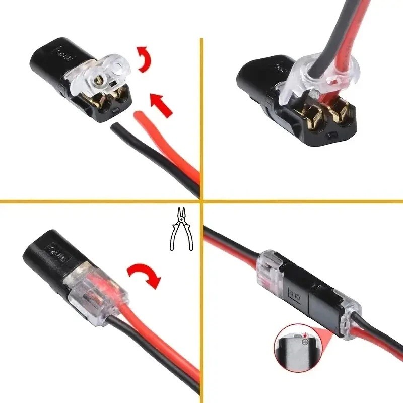 Los conectores rápidos son adecuados para conductores de tipo alambre sólido y trenzado y soportan un rango de 22–20 AWG, es decir, conductores con un diámetro de aislamiento exterior de aproximadamente 1,6–2 mm. En la construcción se incorpora un mecanismo simple pero efectivo, que al ser presionado se encaja y penetra en el aislamiento del cable, creando así una conexión conductiva firme. Gracias a la cubierta superior transparente, es posible verificar visualmente la correcta inserción de los conductores. El conector es compacto, con un tamaño aproximado de 2,18 cm de largo y 1 cm de ancho, por lo que se adapta incluso a espacios reducidos.