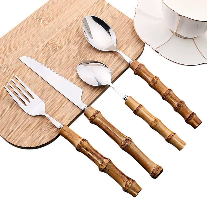 Juego completo de cubiertos para 6 personas que combina acero inoxidable duradero con mango de bambú y es ideal para el uso diario. Descripción completa
