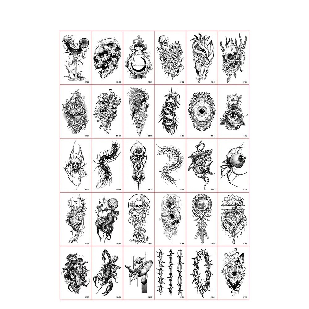 Presentamos un original juego de 30 unidades de tatuajes temporales en blanco y negro de 5,7 x 9,7 cm, que combina oscuros y llamativos motivos de calaveras, ojos realistas, insectos, espinas, detalles animales y elementos de fantasía. Estos motivos de tatuaje son ideales para un aspecto llamativo y audaz que atraerá la atención.