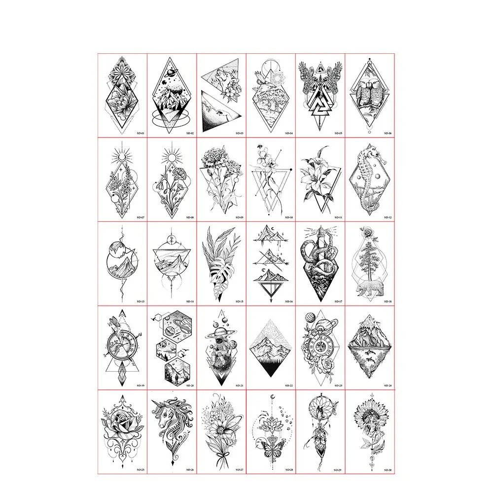 Presentamos una colección original de 30 unidades de tatuajes temporales de 5,7 x 9,7 cm con una combinación única de formas geométricas y motivos naturales. Los diseños incluyen flores, montañas, animales, brújula, mariposas, hojas y otras ilustraciones elaboradas que destacan por su originalidad y estilo.