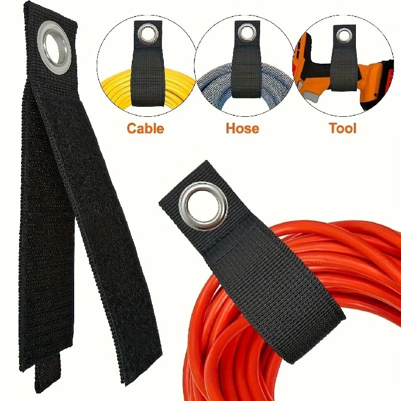 Correas ajustables y resistentes con ojo de metal para colgar y organizar fácilmente cables, mangueras y herramientas en el garaje o taller. Descripción completa
