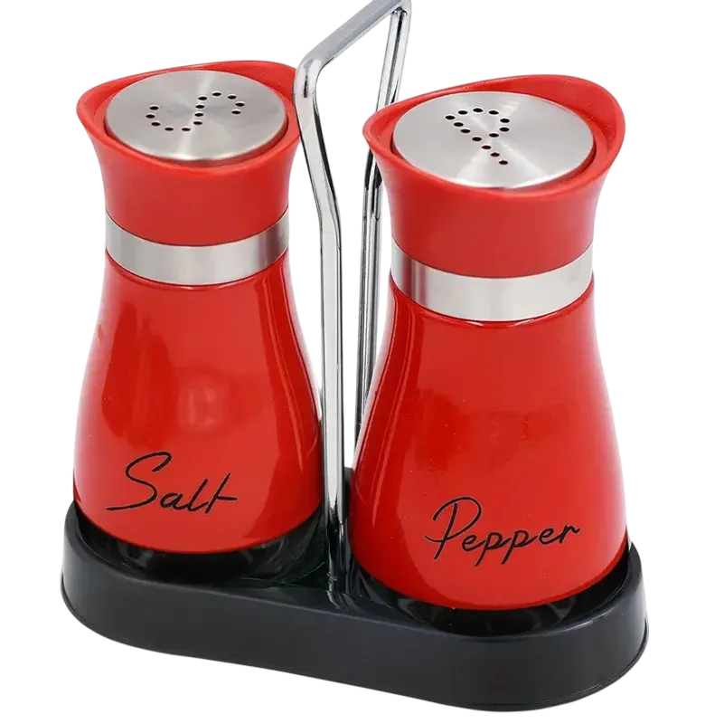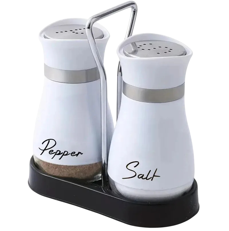Las botellas están diseñadas para permitir un fácil vertido de especias a través de la parte superior. El estante sirve como una base estable que mantiene ambos recipientes juntos y facilita su transporte. El diseño compacto es adecuado para colocar en la encimera de la cocina o en la mesa del comedor.