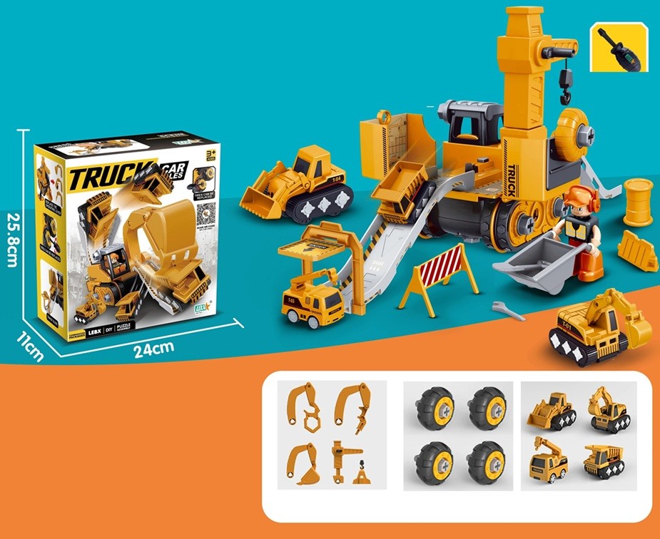 - excavadora principal/puesto de trabajo, 4 brazos intercambiables, 4 ruedas, 4 pequeños vehículos de construcción, destornillador manual, figura, barril, barrera de tráfico y otros pequeños accesorios