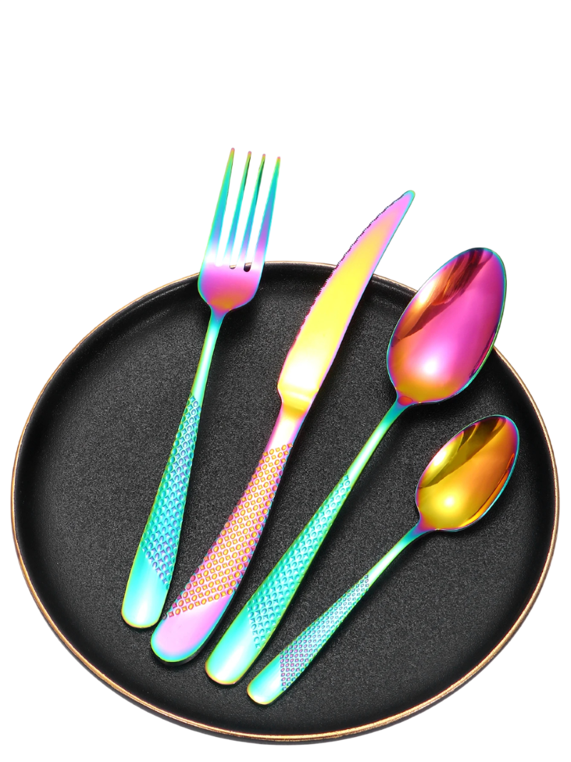 - Contenido del paquete: 6× cuchillo, 6× tenedor, 6× cuchara, 6× cucharita