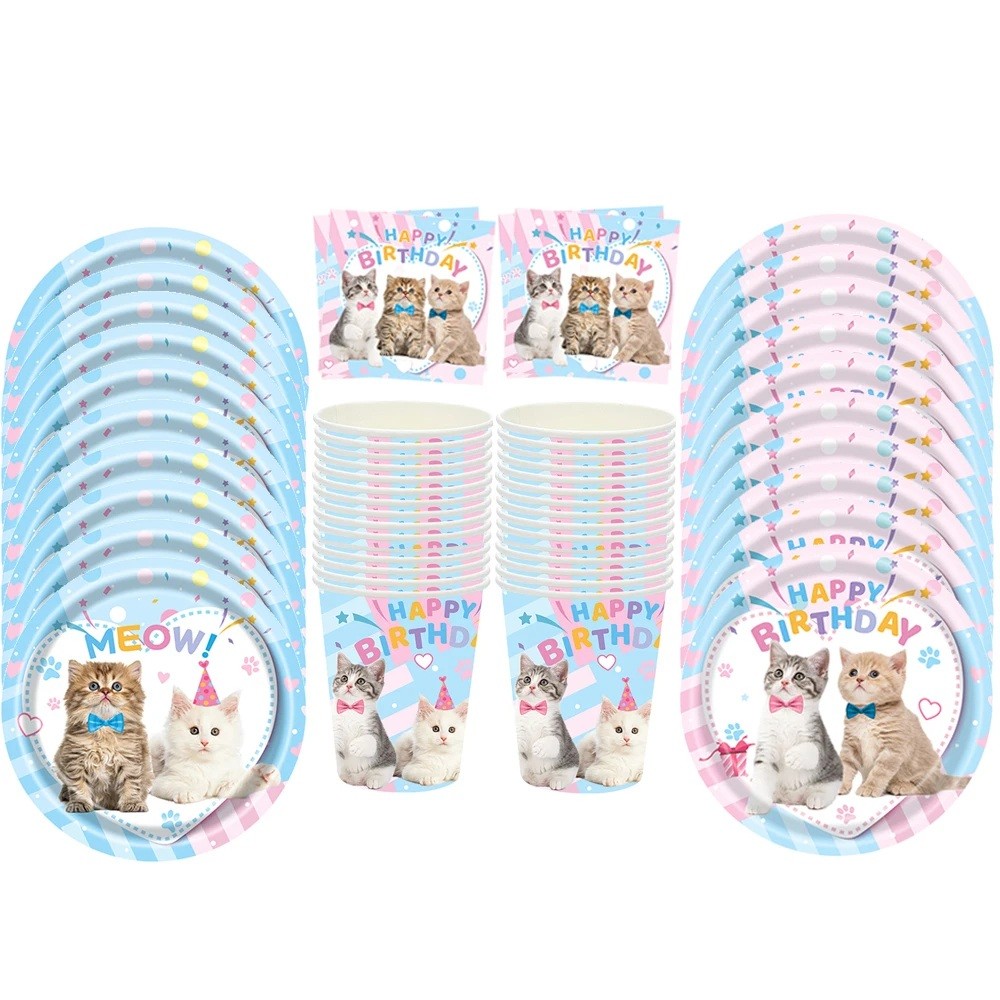 El set de fiesta con motivo de gatitos creará una atmósfera alegre y una hermosa decoración coordinada para la mesa festiva.
