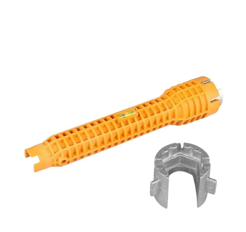 La llave está equipada con un nivel de burbuja integrado, que ayuda a colocar el grifo de manera precisa durante la instalación. La construcción de la herramienta permite trabajar con tamaños comunes de tuercas sanitarias utilizadas en lavabos y fregaderos. Su diseño ergonómico facilita la manipulación y garantiza un agarre estable incluso al trabajar en espacios reducidos.