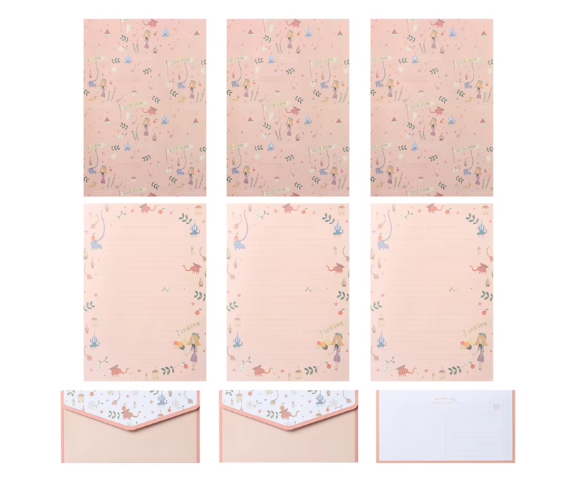 Juego estiloso con un delicado motivo, papel rayado y sobres para escribir deseos, cartas y mensajes personales. Descripción completa