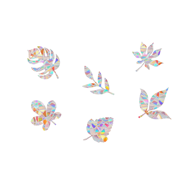 Pegatinas decorativas de PVC con efecto holográfico iluminan ventanas e interiores. El motivo de hojas crea destellos arcoíris al incidir la luz. Descripción completa