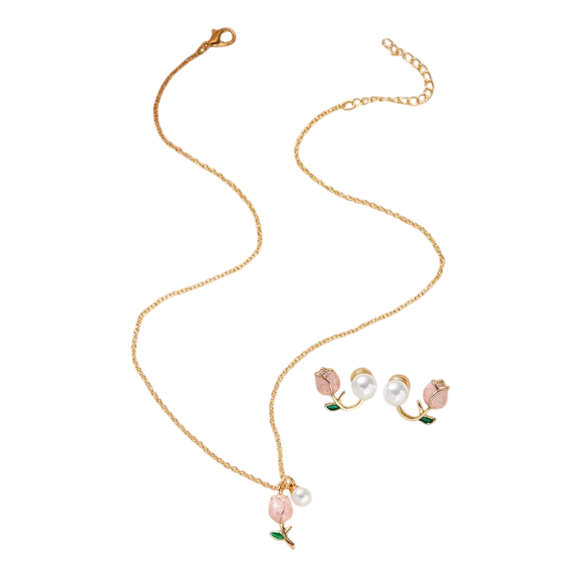El delicado conjunto con motivo de tulipán añadirá un toque romántico a cualquier atuendo, ideal para fiestas, celebraciones o como un bonito regalo. Descripción completa
