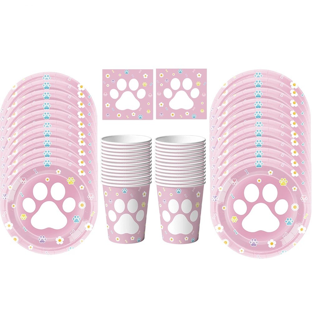 Juego de fiesta completo con diseño rosa de huella de gato que incluye platos, vasos y servilletas. Ideal vajilla desechable para fiestas infantiles. Descripción completa