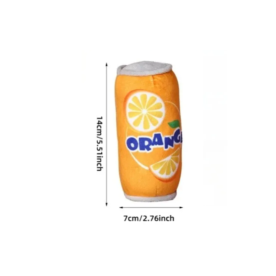 Juguete de peluche silbante en forma de lata naranja para perros, ideal para diversión, masticar y desarrollo del juego. Descripción completa