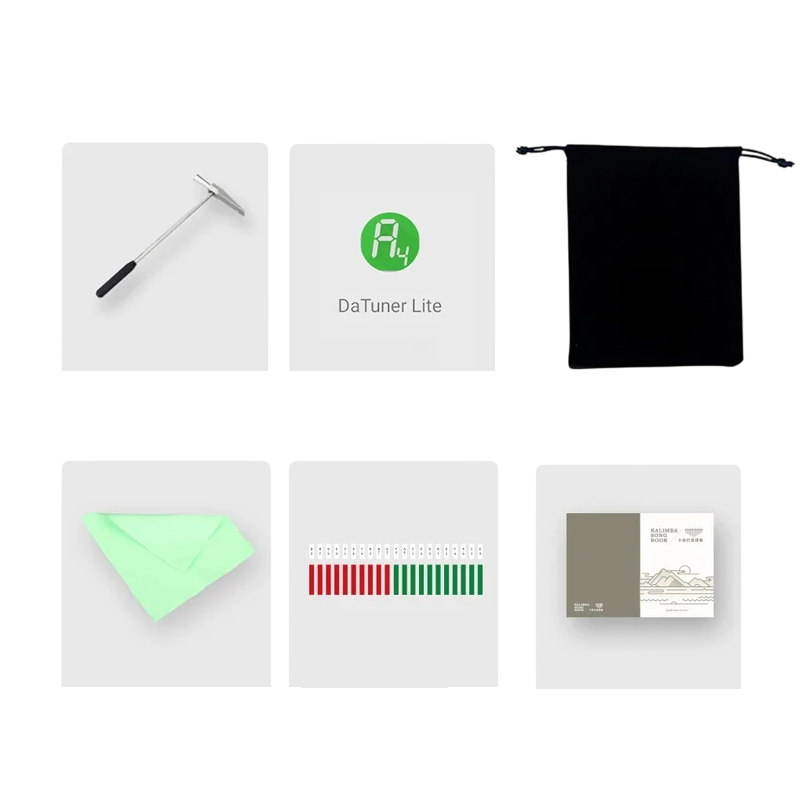 El instrumento tiene unas dimensiones compactas de 16 × 11 cm, lo que facilita su transporte y lo hace ideal para viajes, la escuela o presentaciones. En el paquete encontrarás un conjunto completo de accesorios que te facilitarán tocar y afinar: martillo de afinación, bolsa de almacenamiento, pegatinas con escalas, paño de limpieza y un práctico manual en inglés. La kalimba es una excelente opción para la relajación, la enseñanza musical y la expresión creativa.