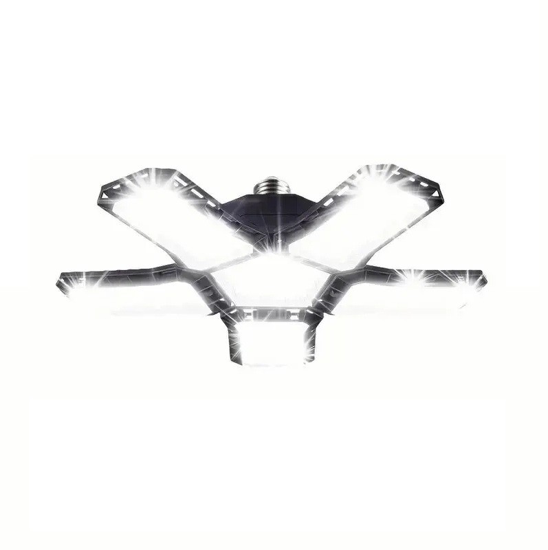 Lámpara LED de 80W con rosca E27 y cinco paneles que ofrece una agradable luz blanca cálida para espacios domésticos, talleres y almacenes. Descripción completa