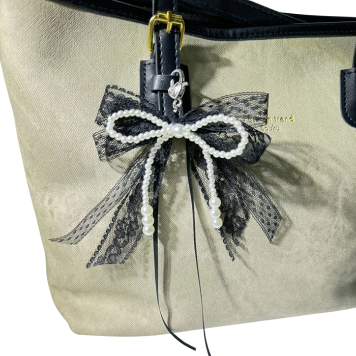 Elegante llavero de perlas con lazo y cinta de encaje es el complemento perfecto para las amantes del estilo romántico. Fabricado con resina de alta calidad, que garantiza ligereza y al mismo tiempo suficiente resistencia para el uso diario. El efecto perlado le da al accesorio un aspecto delicado y lujoso. Este llavero decorativo es adecuado para llaves, bolso o mochila.