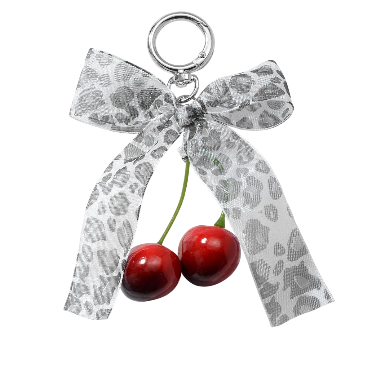 El diseño combina la elegancia clásica con un estilo romántico moderno. El lazo con cerezas crea un elemento visual destacado que atrae la atención. Su construcción ligera asegura un uso cómodo sin carga innecesaria. El práctico anillo de metal permite una fijación fácil y segura a las llaves o al bolso.